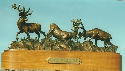 This sculpture depicts two bull elk fighting to attract the attention of females or perhaps to establish dominance. Taking advantage of their distraction, the big bull on the left is heading out to find the cows and claim them for his own.