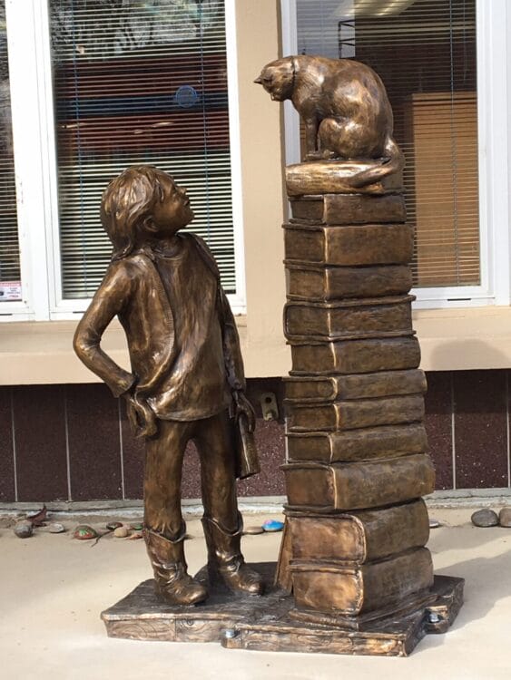 Installation of the life-size LIBRARY CAT took place at the Glendive Public Library on January 30, 2025. The sculptor, Pamela Harr, along with her model Scarlet Smith and proud family gathered for the momentous occasion to pay tribute to the importance of libraries to preserve the unaltered printed words in actual books.